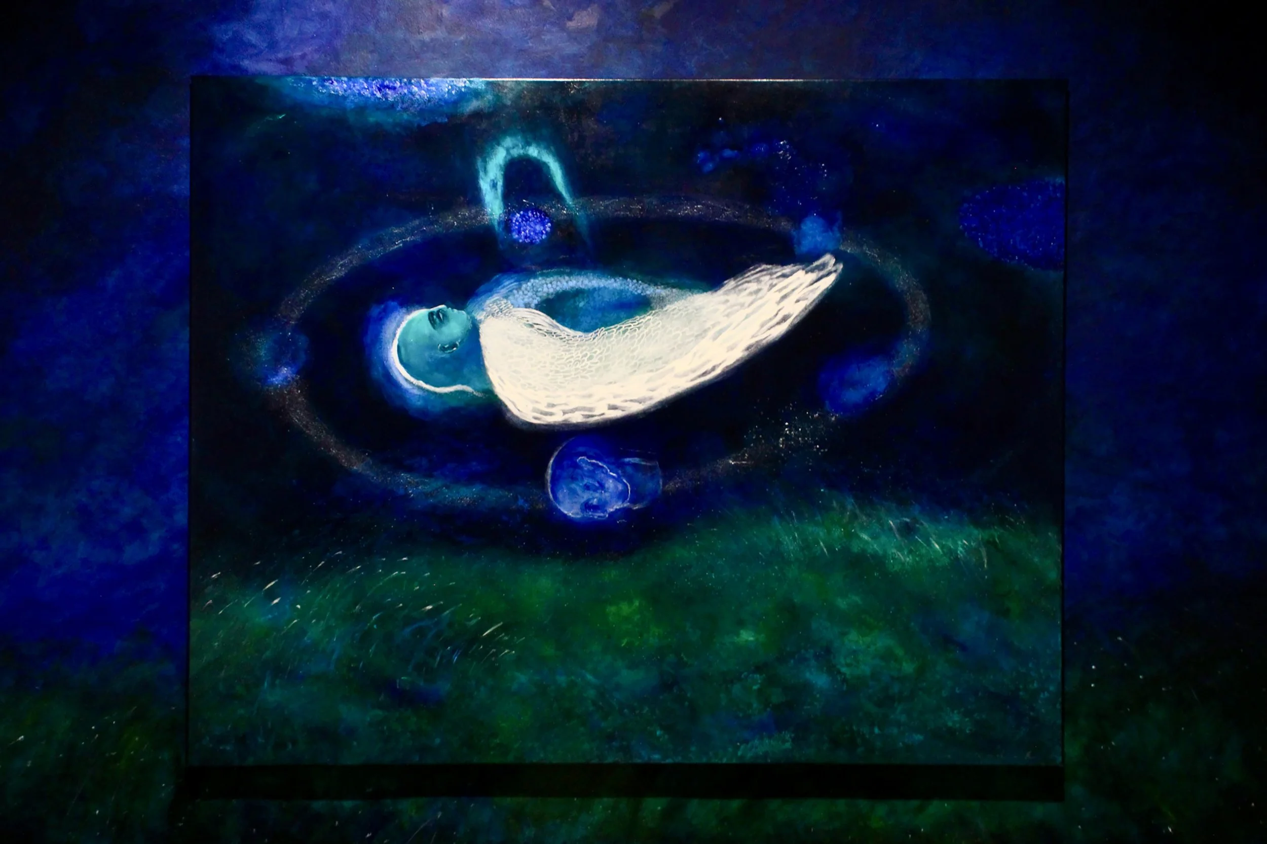 My way of painting has always been to get closer to my true self and don’t drafts before I start to paint on Canvas.Same with this artwork. I started by playing with colors, without a clear idea. During that process at some point, I lose myself in my deepest inner world. What I find there, I spit it out on my paintings. Every feeling, every truth, every vision. It took me over 6 months to finish this artwork. I kept on discovering new parts of my inner world. During these 6 months I listened to Hildegard von Bingen, who is famous for her otherworldly visions. I felt deeply connected to her and her works because my paintings envision existence, places, and things that does not exist in our reality. Something that is in-between. Something between light and shadow, conscious and unconscious.